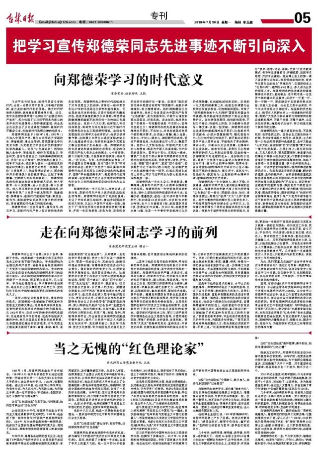 7月30日,《吉林日报》第5版发表“把学习宣传郑德荣同志先进事迹不断引向深入”专刊,刊登了的吉林省委常委、组织部长王凯撰写的《向郑德荣学习的时代意义》、《走在向郑德荣同志学习的前列》和MK体育在线官网党委副书记王延署名发表的《当之无愧的“红色理论家”》三篇文章。 《向郑德荣学习的时代意义》一文从“郑德荣同志一生在马言马、懂马信马、传马护马,是新时代共产党人坚定信仰追求的生动写照”“郑德荣同志一生不忘初心、对党忠诚、...