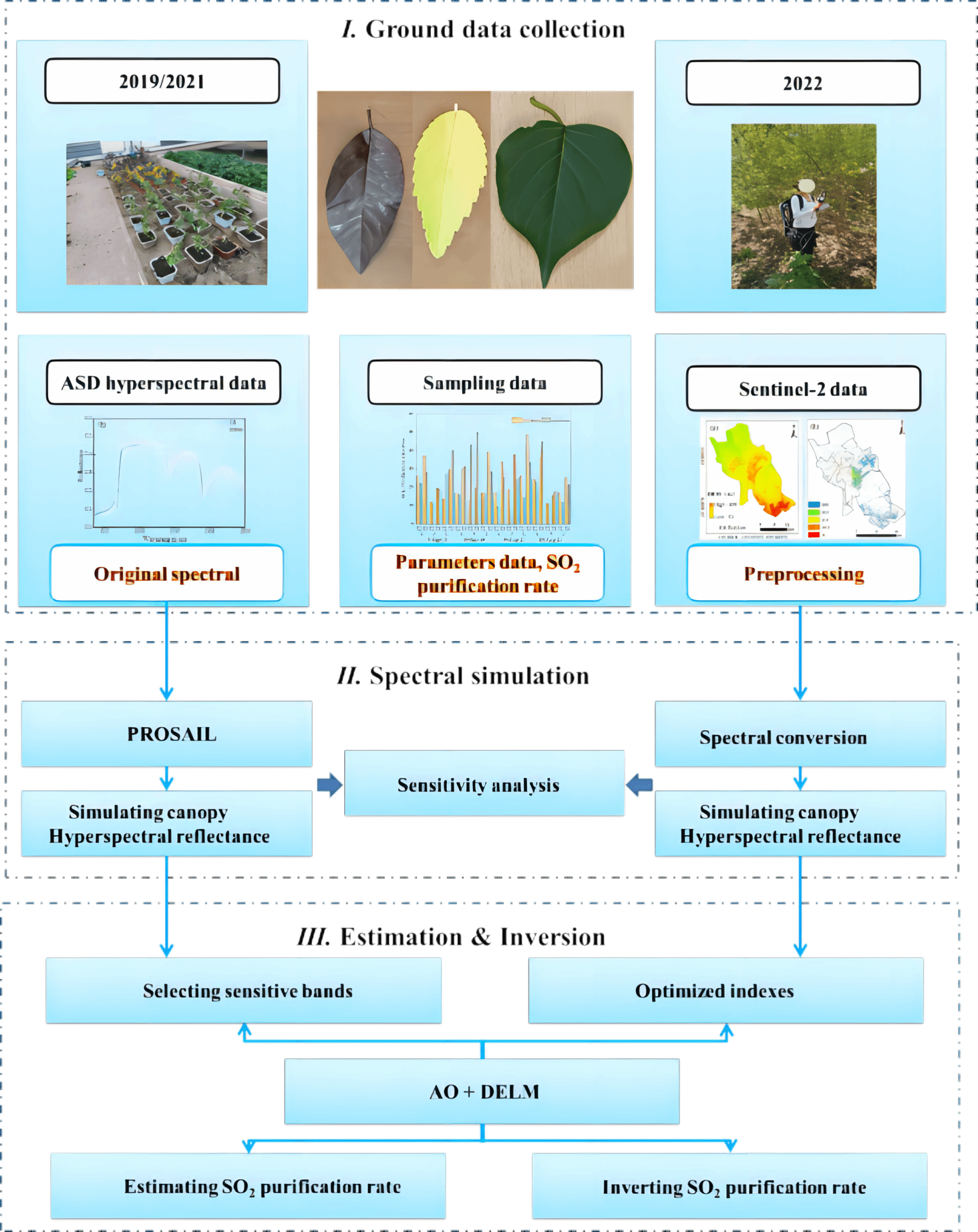 该研究结合PROSAIL模型、植被生化参数信息和SO2净化能力, 构建出PROSAIL和AO-DELM模型耦合的城市森林SO2净化能力估算方法。首先选择长春市作为研究区, 通过城市绿化树SO2胁迫下模拟试验, 获取生理生化实验数据;其次, 实验数据输入到PROSAIL模型中, 模拟城市森林冠层光谱, 对每个参数进行全局和局部敏感性分析, 以确定不同SO2胁迫下的参数, 进而模拟SO2不同净化水平下的冠层光谱, 并构建高光谱指数,进而与SO2净化率进行相关性分析, 以获得最佳指数;之后, 利用最佳指数和Aquila优化器优化的深度极限学习机 (DELM) 方法估算城市森林冠层中的SO2净化率, 从而得出SO2净化率估算方法;最后, 该方法应用于研究区Sentinel-2多光谱影像, 从而得到群落尺度下长春市城市森林SO2净化能力的反演结果 (图1) 。