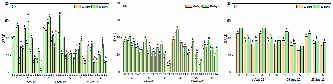 图4 SO2胁迫下城市绿化树叶片SPAD值 (a) 紫丁香 (b) 红叶李 (c) 金叶榆