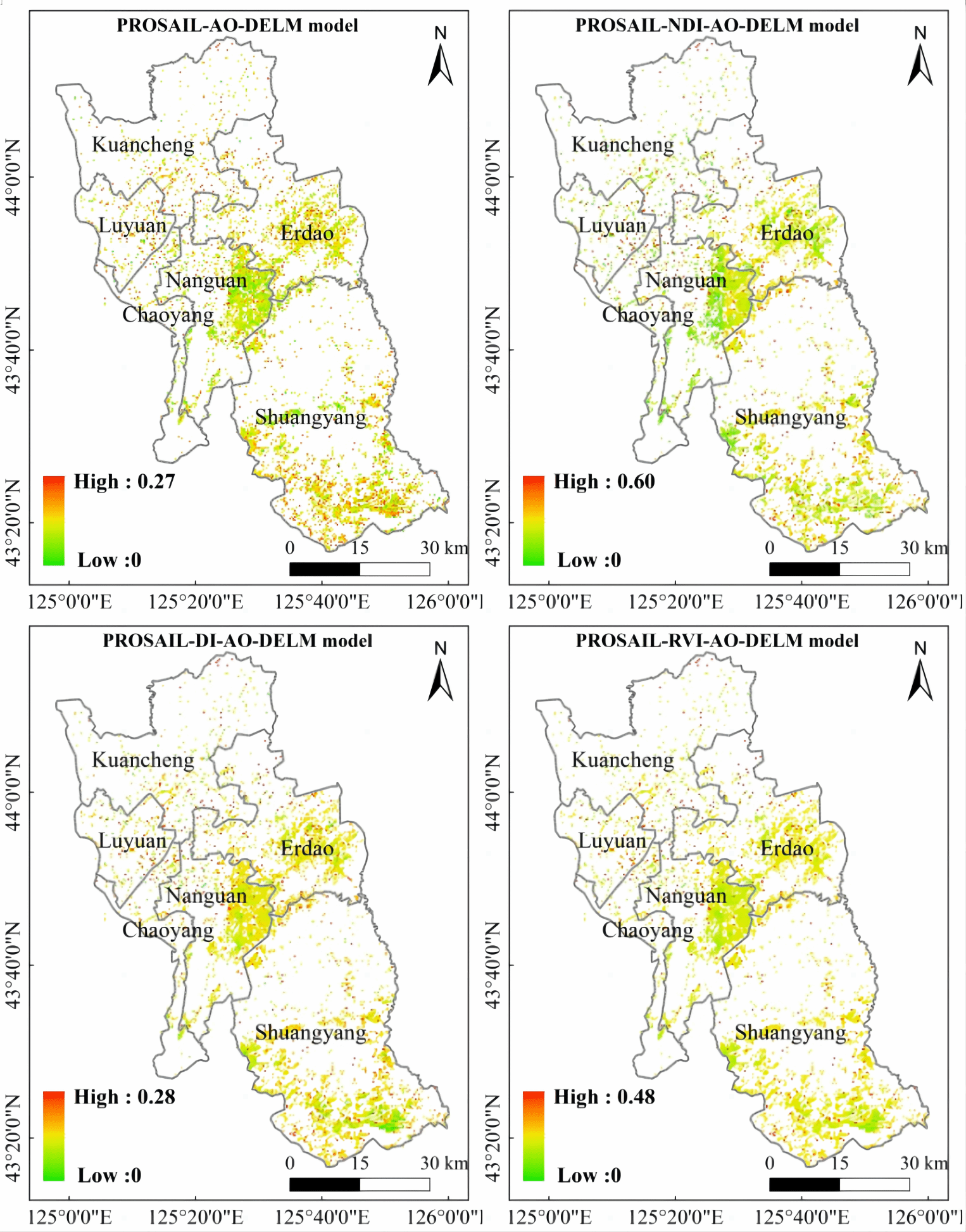 基于模拟的植被冠层光谱, 在不同净化水平分别构建出光谱子集、NDI (653, 688)、DI (775, 772) 和RVI (653, 688) 与AO-DELM组合的4种估算方法。结果表明, 由光谱子集 (580-680 nm) 构建的PROSAIL+AO+DELM模型比光谱指数模型估算性能更好 (图6) 。