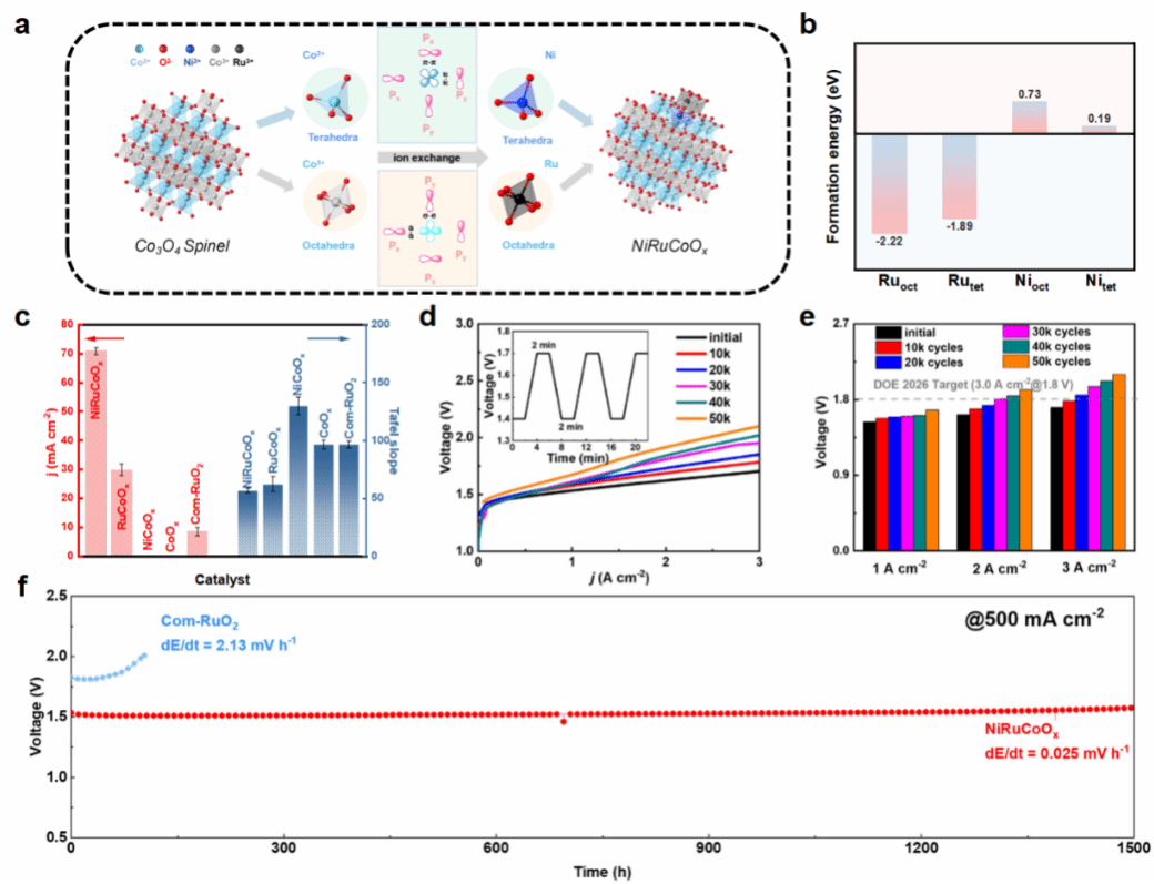电解水技术可绿色高效制取氢气,作为电解水的阳极半反应,氧气析出反应(OER)高度依赖铱基贵金属催化剂。过渡金属氧化物电催化剂在酸性条件下进行OER时存在不稳定性问题,极大限制了它们在质子交换膜电解水(PEMWE)中的应用。为应对该挑战,团队将Co3O4中的部分Co替换为Ni和Ru调整其尖晶石结构(如图1),充分利用Co3O4中四面体和八面体位点之间的协同作用增强OER电催化活性和稳定性。结果表明,Ru是双原子氧机制中的活性位点,而Ni则稳定晶格氧和Ru−O键。NiRuCoOx催化剂表现出极低的OER过电位(166 mV@10 mA cm−2)。在PEMWE器件上达到3 A cm−2的电流密度仅需1.72 V,满足美国能源部(DOE)设定的2026目标(<1.8 V@3 A cm−2)。PEMWE装置可稳定运行1500小时,性能衰减率仅为0.025 mV h−1。该工作为开发低成本高效酸性水电解催化剂提供了可行借鉴,相关成果以“Tailoring octahedron-tetrahedron synergism in spinel catalysts for acidic water electrolysis”为题,发表于国际知名期刊J. Am. Chem. Soc.;论文第一作者为MK体育在线官网化学学院博士研究生霍孟田,通讯作者为MK体育在线官网化学学院常进法教授、邢子豪副教授以及美国中佛罗里大学杨阳教授。相关技术已经申请中国专利,申请号:202410593475X。此外,团队在水电解方面的相关系列工作先后发表于Small, 2025, 13, 2412729; Nano Res. 2025, 18(3), 94907243; ChemCatChem, 2025, 17(6), e202401950, Green Carbon, 2024, 2 403-404等。