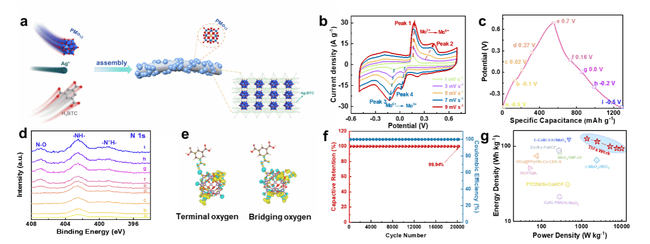 NH4+超级电容器由于其低成本、高安全性、环境可持续性和高效的电化学能量存储能力,为未来的发展提供了较大潜力。目前的电极材料普遍存在层间距小、空间位阻大、充放电过程中活性位点与NH4+的可及率低,难以获得高容量电荷储存。此外,充放电过程中NH4+大量在层间运动,严重影响了电极材料稳定性。为此团队首次利用富含端氧位点的keggin型多金属氧酸盐{PMo12}作为活性中心,通过将其稳定限制分散在小孔径的Ag-BTC外表面,合成电极材料{PMo12}@Ag-BTC,实现NH4+与{PMo12}端氧位点的可及性,有效加快充放电的动力学过程。如图2,{PMo12}@Ag-BTC作为电极材料表现出明显的赝电容控制表界面储能过程,1 A g-1电流密度下的电容值为619.4 mAh g-1。组装的{PMo12}@Ag-BTC//{PW12}@Ag-BTC器件在20,000次循环测试中保持稳定,并在1.5 A g-1电流密度下获得了125.3 Wh kg-1的能量密度。该工作为多金属氧酸盐在NH4+超级电容器电极材料设计方面提供了新思路。相关成果以“Interface Storage Mechanism in Aqueous Ammonium-Ion Supercapacitors with Keggin-type Polyoxometalates-Modified Ag-BTC”为题,发表于国际知名期刊Adv. Mater.;论文的第一作者为MK体育在线官网化学学院博士研究生梁宇;通讯作者为MK体育在线官网化学学院常进法教授、朱广山教授以及邢子豪副教授。相关技术已经申请中国专利,申请号:202410593017.6。此外,团队在超级电容器方面相关系列工作还发表于Green Carbon, 2024, 2, 320-321等。