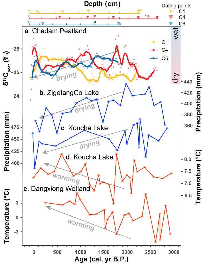 图2. 查旦泥炭地地表湿度重建结果与青藏高原中部古气候记录对比