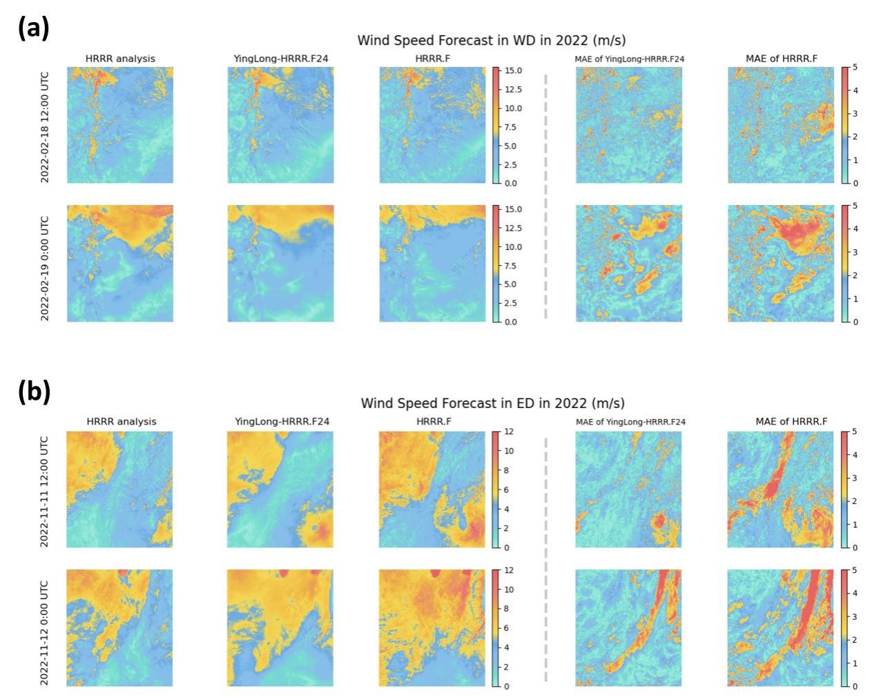 本研究围绕高分辨率区域天气预报的大模型展开探讨,将预报的空间分辨率提升至3km × 3km。模型采用AFNO与Swin Transformer并行融合的新型网络架构,并引入边界平滑策略以有效整合区域边界信息。此外,通过耦合全球预报与区域预报的方法,显著提升了区域预报的准确性。在48小时预报任务中,该模型的预测效果与HRRR数值预报模式相当,且在10米风速等近地面变量以及低空变量的预报精度上优于传统数值模式。