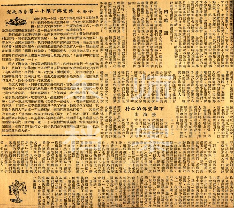 学校还组织2100多名学生到长春市郊,动员群众参加抗美援朝运动。图为1950年第26期校刊发表的学生下乡记事和心得体会等文章。