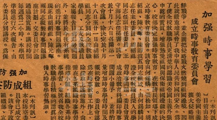 1950年第23期校刊发表的“加强时事学习,成立时事教育委员会”的通讯