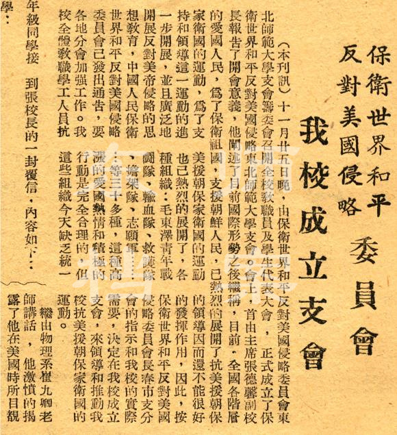 1950年第27期校刊发表“保卫世界和平反对美国侵略委员会,MK体育在线官网成立支会”新闻,宣布支会委员名单