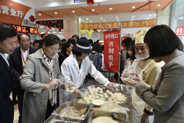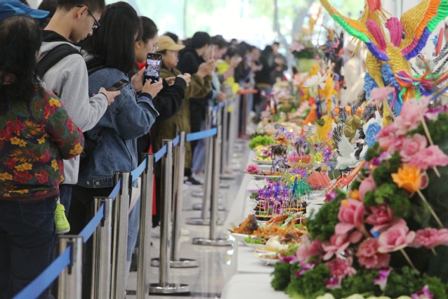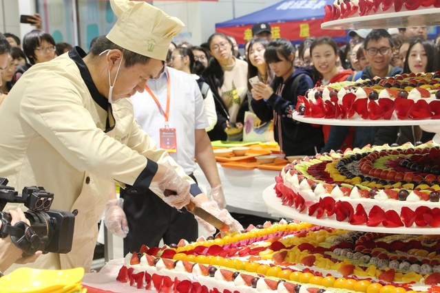9月30日,美食节主题展览隆重举行,现场气氛热闹非凡。所有餐厅档口均八折优惠;烤全羊、松鼠鱼、麻辣小龙虾、海鲜汇、烘焙点心、水果拼盘、各色炒菜等百余种出自东师后厨的特色美食呈现在展台上,供师生欣赏和品尝;现场制作高达4层的巨型水果蛋糕,在午餐时间免费分给师生享用;两个餐厅分别设置“幸运屋”,供学生抽奖领取用餐代金券;“美食制作区”供师生亲手体验美食制作过程; “米”“面”“油”“木耳”等原料展示区供大家了解食材品质;“万里长城”“白山黑水”“东方巨龙”等栩栩如生的食材雕刻,引得师生纷纷驻足拍照。活动期间,学校党委副书记兼副校长马晓燕及相关部门负责人一行来到餐厅,与学生一同体验各项活动。