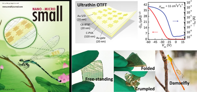 超薄有机场效应晶体管具有质量轻、超柔性及可随形贴合的优势,在制备电子皮肤等可穿戴电子设备中具有良好的应用前景。相比于在传统的刚性衬底上制备的有机场效应晶体管器件,超薄的有机场效应晶体管迁移率普遍较低(10-1 cm2 V-1 s-1),限制了其进一步发展。针对这种问题,汤庆鑫课题组于2018年8月在Small(2018, 14, 1801020)发表了题为“High-Performance, Ultrathin, Ultraflexible Organic Thin-Film Transistor Array”的研究论文,并被选为封面文章重点介绍。在该论文中,通过溶液法制备了自支撑的高性能有机薄膜场效应晶体管阵列,迁移率最高可达11 cm2 V-1 s-1。器件的厚度仅为380 nm,质量约为 0.89 g cm-2,因此这种器件可以贴合于三维曲面、人体皮肤甚至昆虫豆娘的翅膀上而不影响其翅膀的振动及飞行,并且在折叠状态下器件仍然可以正常工作。