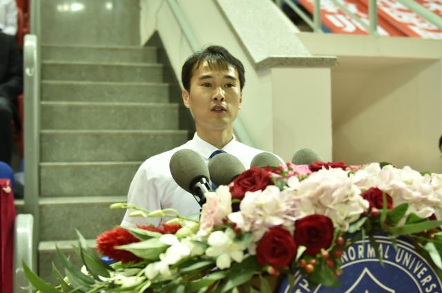 刘益春向2018届毕业生致辞。他说,几年来,同学们刻苦努力,学业精进,获得高水平创新性成果、发表高水平学术文章,在多项高级别赛事中取得优异成绩;积极参与校内外志愿服务,投身公益事业,回报母校,温暖社会。这几年,学校践行“尊重的教育、创造的教育”理念,不断深化教育教学改革,建设“创造的课堂”,致力于培养学生的创新意识、创造激情和创造的能力;同学们经历了学校七十年华诞,见证了桃李芬芳;学校6个学科入选国家“双一流”建设,6个学科在教育部学科评估中进入A类,同学们共同感受到了作为东师人的荣光。学校发布并推广《师德公约》和《MK体育在线官网师铭》,引导大家“弘扬师者仁心,传承大爱师魂”。最近,从校园到社会,掀起了向“全国优秀共产党员”“全国优秀教师”、MK体育在线官网荣誉教授郑德荣同志学习的热潮,郑先生的先进事迹与高尚品德,是母校赠予同学们的精神财富,将激励大家成长。刘益春勉励同学们要葆有“为天地立心,为生民立命,为往圣继绝学,为万世开太平”的家国情怀,珍惜伟大时代,牢记责任担当,做新时代的奋斗者。他对同学们提出三点希望:要德才兼修,懂得规划,将个人的发展目标与祖国的命运紧密相连,自觉把个人发展规划融入国家发展的宏伟蓝图,坚定理想信念,锤炼品格意志,明确奋斗方向,在新时代的广阔天地中大展其才;要矢志创新,坚毅执着,在各自的工作中要矢志不渝,坚守本心,勇于创新,共同让创新成为民族发展的不竭动力;要胸怀理想,务实笃行,改造世界要从点滴做起,要带着母校赋予的精神力量,锲而不舍、一步一个脚印地去行走,既仰望星空又脚踏实地。最后,他饱含深情地说,“当你们奔赴下一站时,母校是你们永远的地标和永恒的心灵驿站,也为你们指明回家的路,期待你们常回家看看!”