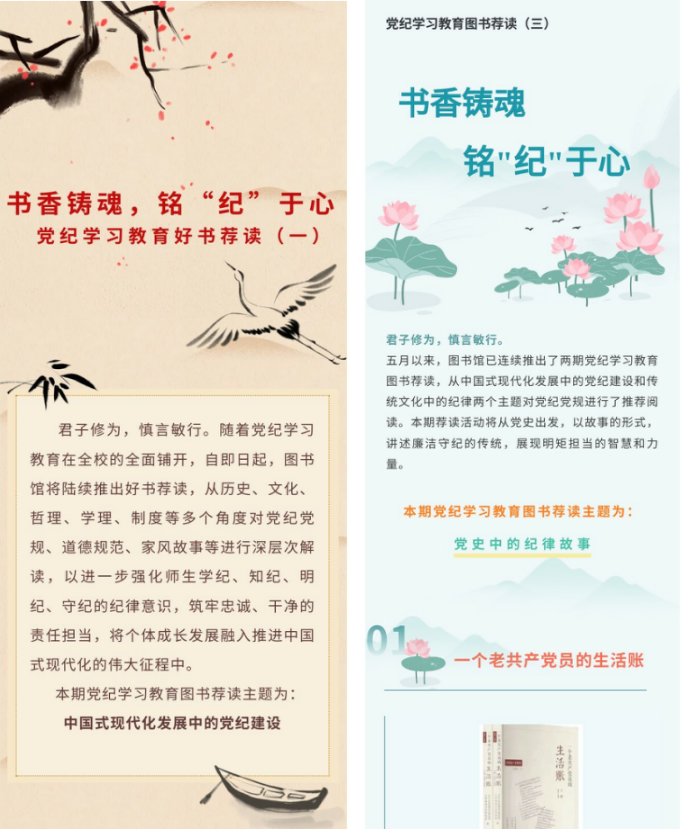 图书馆充分利用线上线下两种阅读推广途径。一方面,利用图书馆实体空间进行党纪学习教育专题图书展览,让来馆的师生在潜移默化中接受党纪学习教育的熏陶。另一方面,通过图书馆微信公众号,开展线上图书阅读推广活动,以“中国式现代化发展中的党纪建设”“传统文化中的纪律”“党史中的纪律故事”为主题,向全校读者推荐了与党纪学习教育紧密相关的图书。