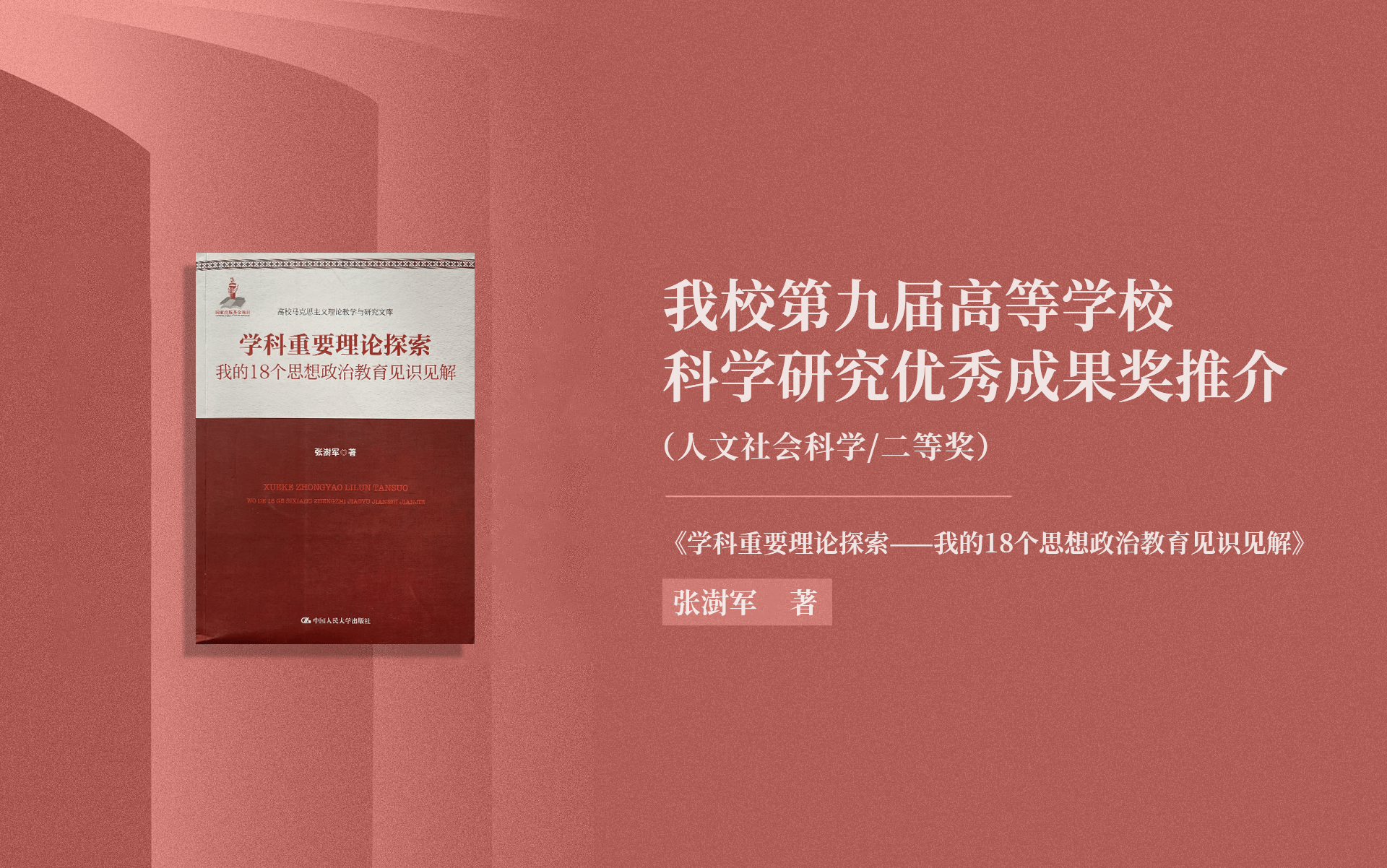获奖成果:《学科重要理论探索——我的18个思想政治教育见识见解》中国人民大学出版社,2018年5月MK体育在线官网 张澍军著思想政治教育二等奖一、篇章结构 本书设置18章,50余万字,分为三个模块。1.思想政治教育基础理论研究(一至五章),包括思想政治教育的政治观、本质观、载体认知与建构、思维视角、前提承诺等。2.思想政治教育学科建设研究(六至九章),包括思想政治教育学科化、学科深层价值、学科使命、德育哲学学科建构...