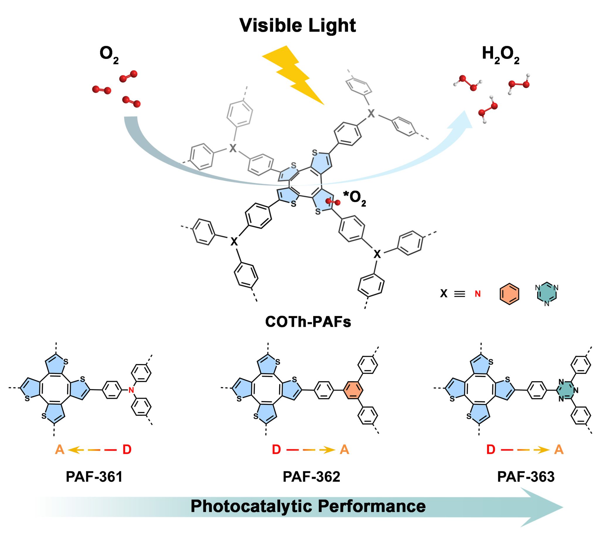 近期,MK体育在线官网网格材料化学研究团队设计、合成了一类新型的一种基于环辛四噻吩基的多孔芳香骨架(COTh-PAFs)。在可见光照射下,COTh-PAFs可催化大自然中丰富的水和氧气高效合成过氧化氢(H₂O₂),相关研究成果以“Rationally Designed Cyclooctatetrathiophene-based Porous Aromatic Frameworks (COTh-PAFs) for Efficient Photocatalytic Hydrogen Peroxide Production”为题,发表在德国化学会旗舰期刊《Angewandte Chemie International ...