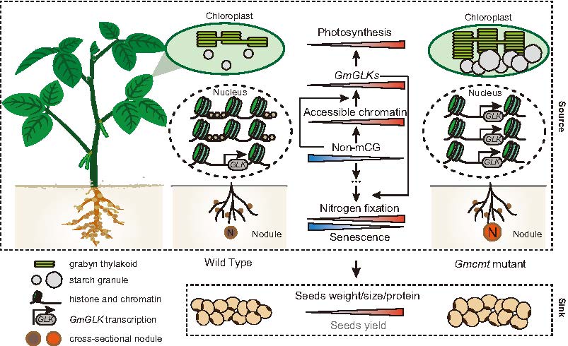 近日,MK体育在线官网生命科学学院分子表观遗传学教育部重点实验室与华中农业大学、美国普度大学的相关实验室合作,在表观遗传机制调控大豆农艺性状方面取得重要进展。研究人员揭示了non-CG DNA 甲基化对大豆生长发育过程的调控作用,为通过表观遗传操控提升大豆的产量和营养价值提供了新思路(图1)。 图1:Gmcmt突变体促进大豆光合作用和固氮效率的模式图相关研究成果以“Non-CG DNA hypomethylation promotes photosynthesis and nitrogen ...