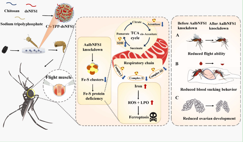 近日,由MK体育在线官网生命科学学院细胞生物学方向刘罡课题组、动物学方向王寅亮课题组以及化学学院物理化学方向江秀梅课题组联合组成的学科交叉团队,通过鉴定白纹伊蚊铁硫簇合成关键蛋白AableNFS1并以之为靶点,研发出TPP交联壳聚糖纳米防蚊材料。以此防蚊材料对白纹伊蚊幼虫进行饲喂,可以显著抑制其飞行、吸血、繁殖等行为,展现出优越的防蚊效果和易操作性(图1)。相关成果以“Development of a multi-effect CS-TPP-dsNFS1 mosqui...