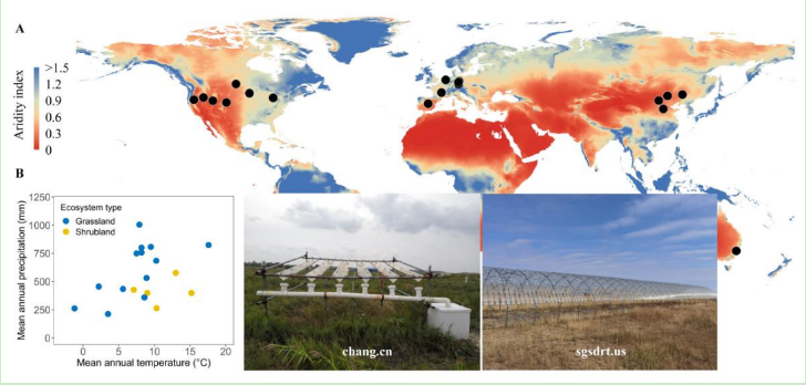 近日,MK体育在线官网生命科学学院孙伟教授团队在草地全球变化生态学领域取得重要研究进展。团队利用国际干旱研究网络(Drought-Net)平台,分析了全球19个站点在极端干旱处理(百年一遇)下土壤有机碳(SOC)及其组分(颗粒有机碳POC和矿物结合有机碳MAOC)在1至5年内的变化特征,揭示了干旱对SOC及其组分影响的区域依赖性,特别是POC和MAOC在不同干旱条件下的差异化响应。相关成果以“Aridity drives the response of soil total and particulate ...